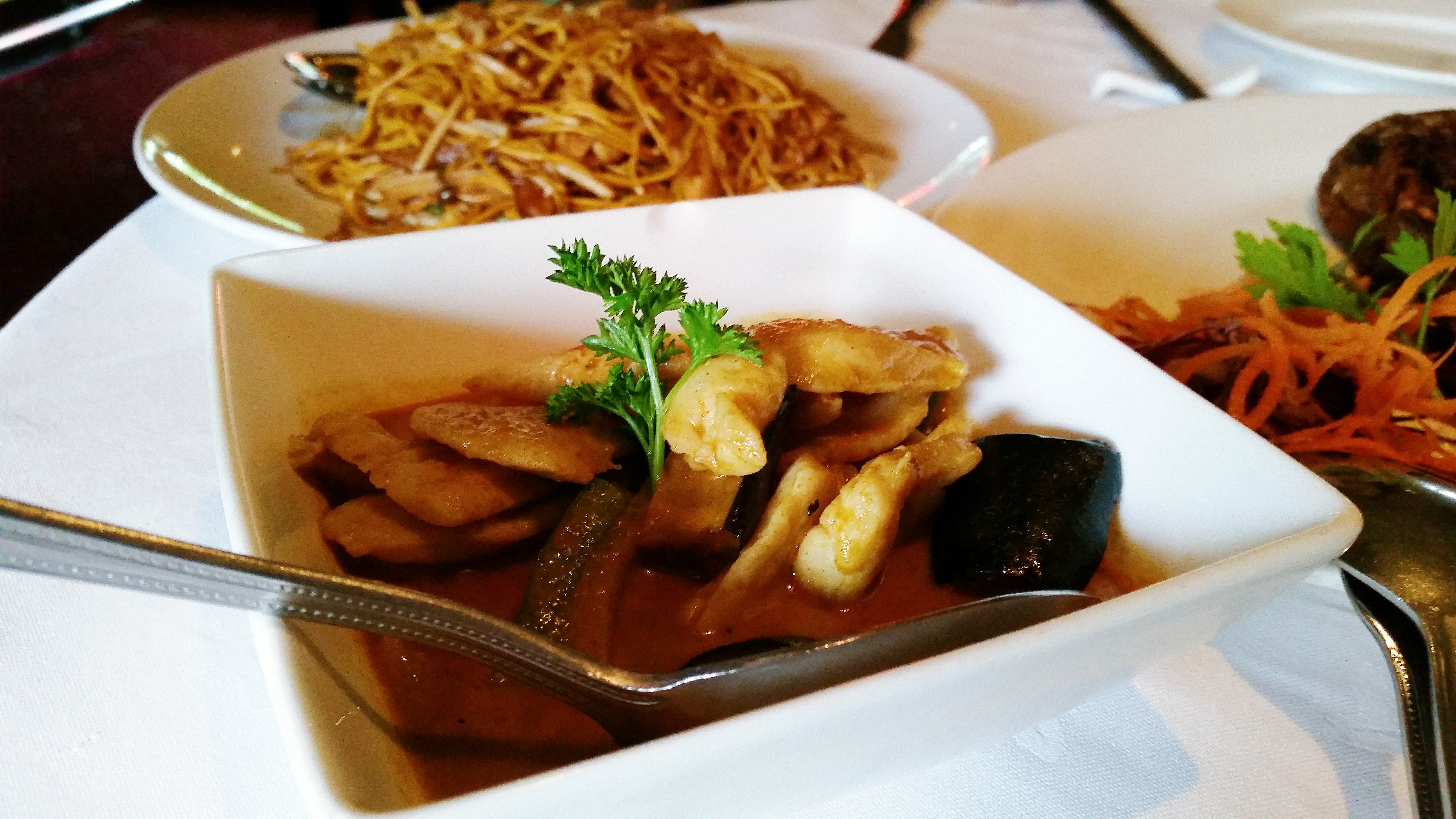 As per usual, Steak smelt chicken satay in the restaurant before she even glanced at the menu, and thus, they formed our starter. The rest of our order included malaysian-style chicken curry, chicken-fried noodles, steamed rice and a half-portion of crispy aromatic duck. Poultry, poultry, and more poultry. In hindsight I realised that I wanted to try some of their seafood, but sadly when I do see food, I order without thinking. (Stupid cliche pun intended. Forgive me and move on).