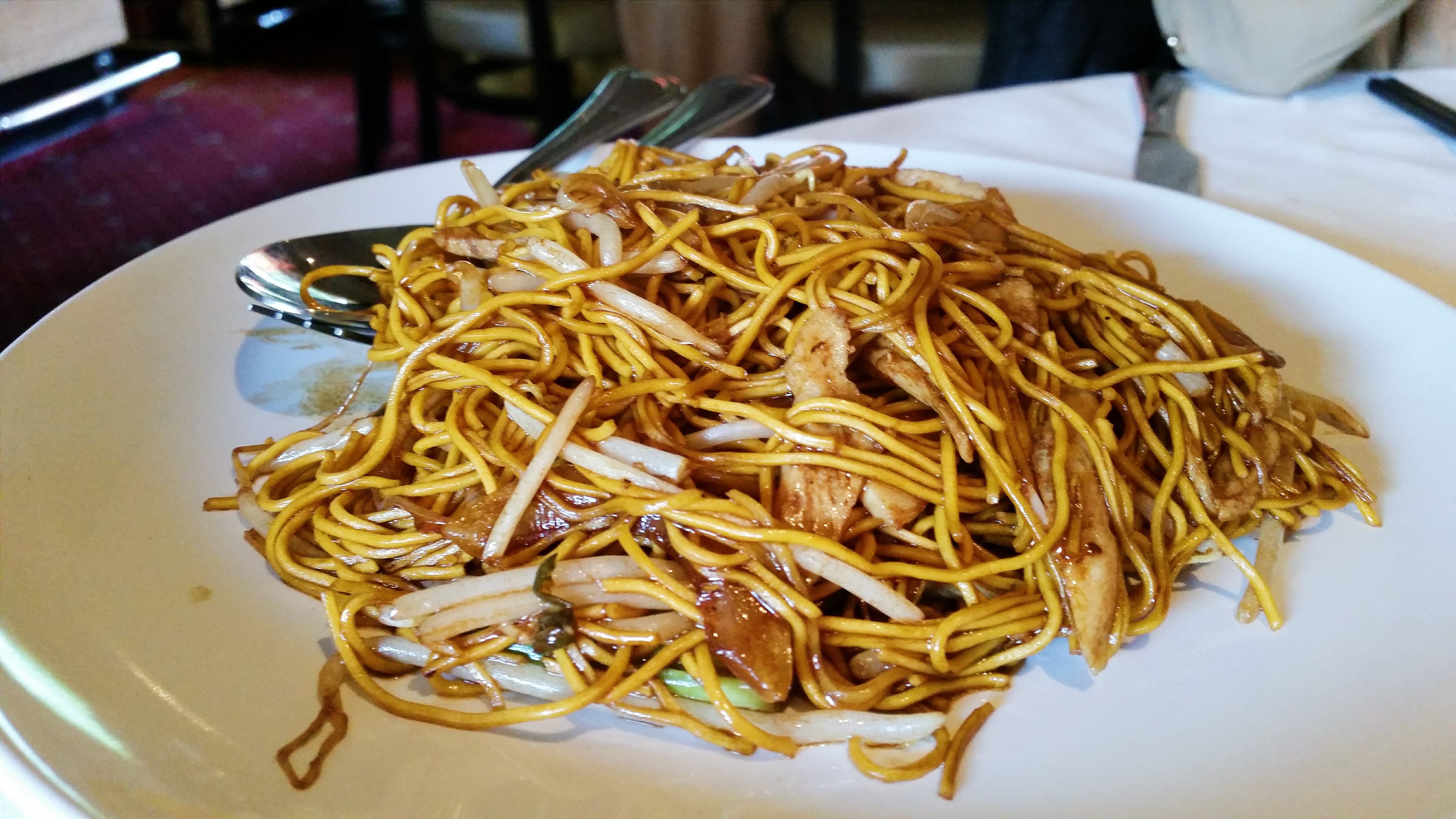 But, whilst Feng Shang has an attractive and interesting exterior face, it’s not quite as inspiring on the inside. (Then again, neither am I. Exterior’s pretty hideous too). Whilst there are a few interesting ornaments here and there, the interior decor as a whole is rather drab and dreary with it’s best days evidently far behind it. The restuarant is filled with plain wooden tables covered with bland tablecloths and awkwardly-protruding speakers, whilst the red carpet screams “HELP I BELONG IN AN INDIAN RESTAURANT FROM THE 80’s”. It may be a little more attractive during the night, (when everything lights up like a neon nightclub on ecstasy), but either way, you’d expect a little more investment interiorly for a restaurant with as unique a setting as this. To be brutally honest, the “.5” in the decor score is simply due to the novel “restaurant-floating-on-water” factor.