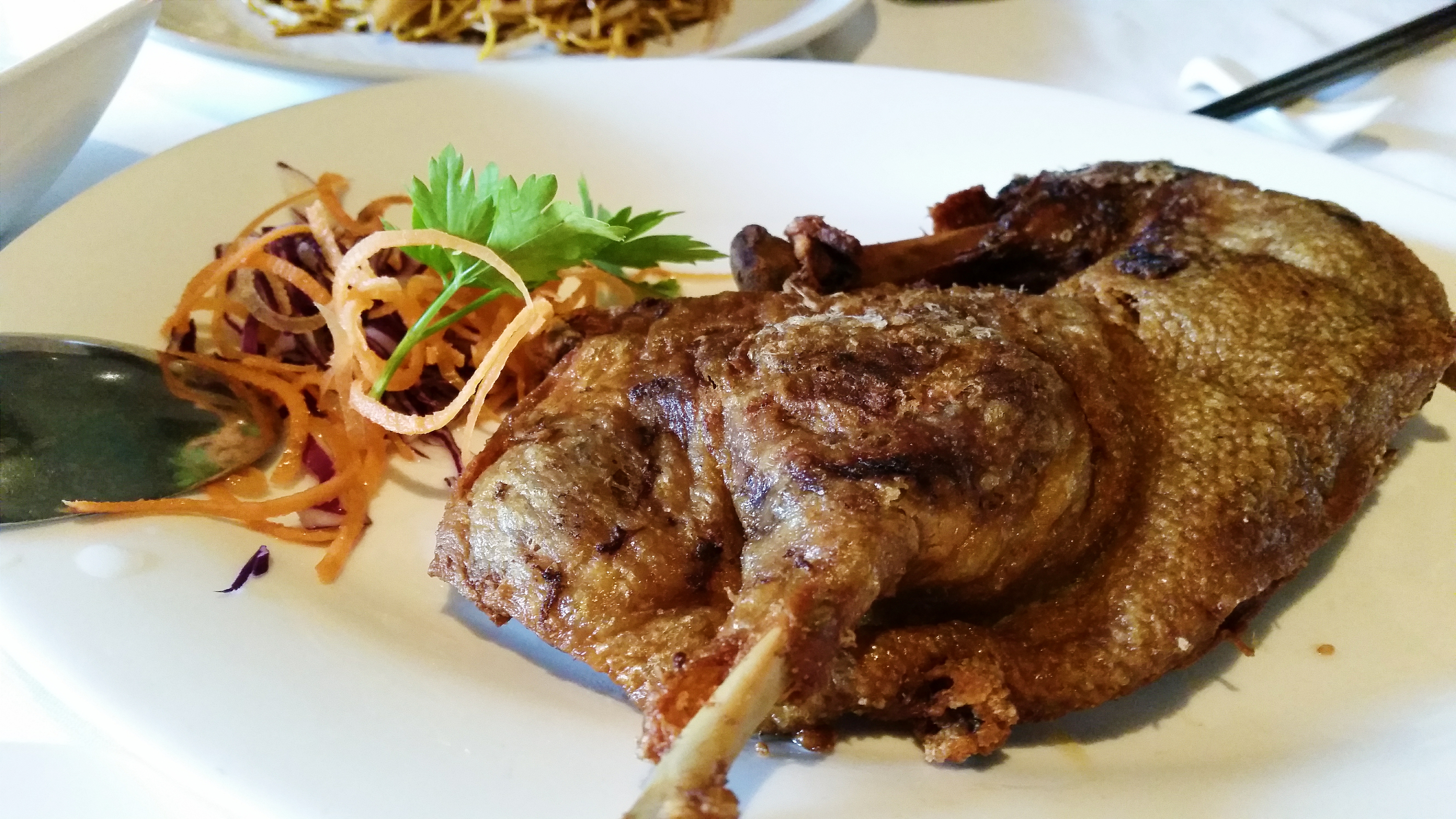 Luckily, the crispy aromatic duck wasn’t made of rubber. (Nor was it yellow or accompanied by bath water). As it arrived with a basket of steamed pancakes, a plate of cucumbers and spring onions, and a bowl of plum sauce, I rubbed my hands with delight. The waiter offered to shred the duck for me, but I opted to shred it myself for my own amusement. I don’t care if you or Steak think I am a child, there’s no fun in having your meat cut for you. The duck had a deep-fried, crispy skin, with soft and well-cooked meat within that shredded with ease. Whilst a little dry, the duck offered an enjoyable, savoury flavour.