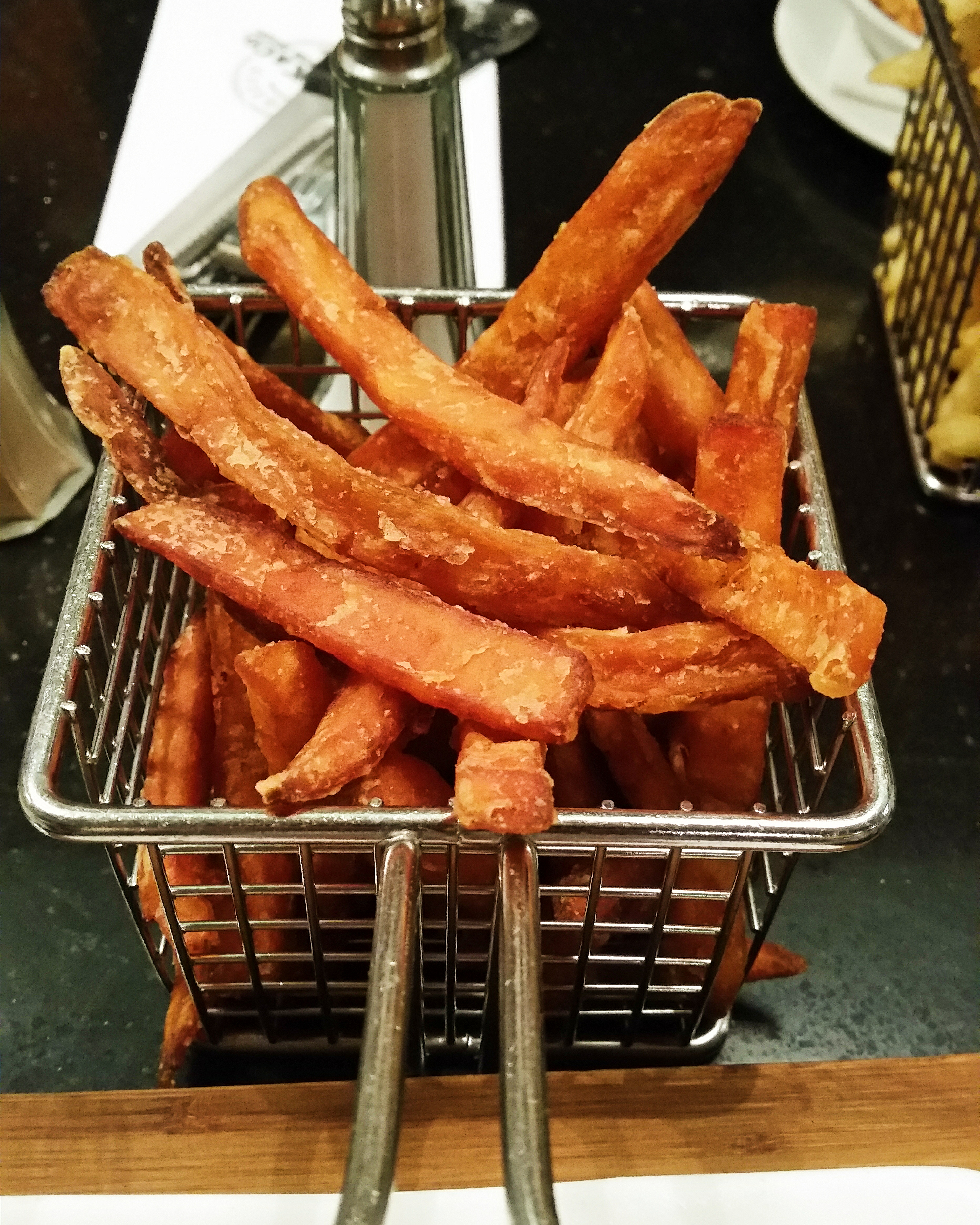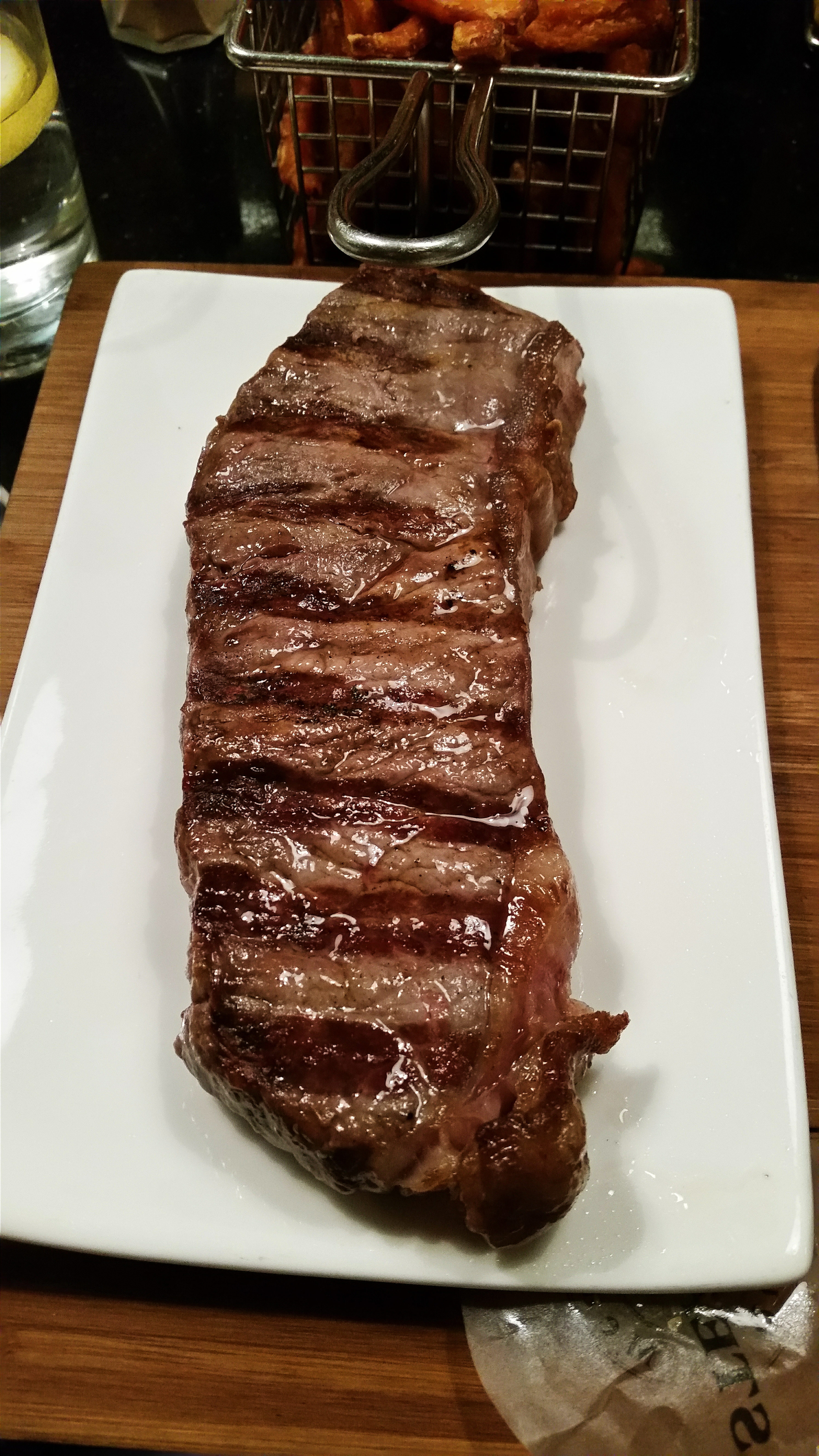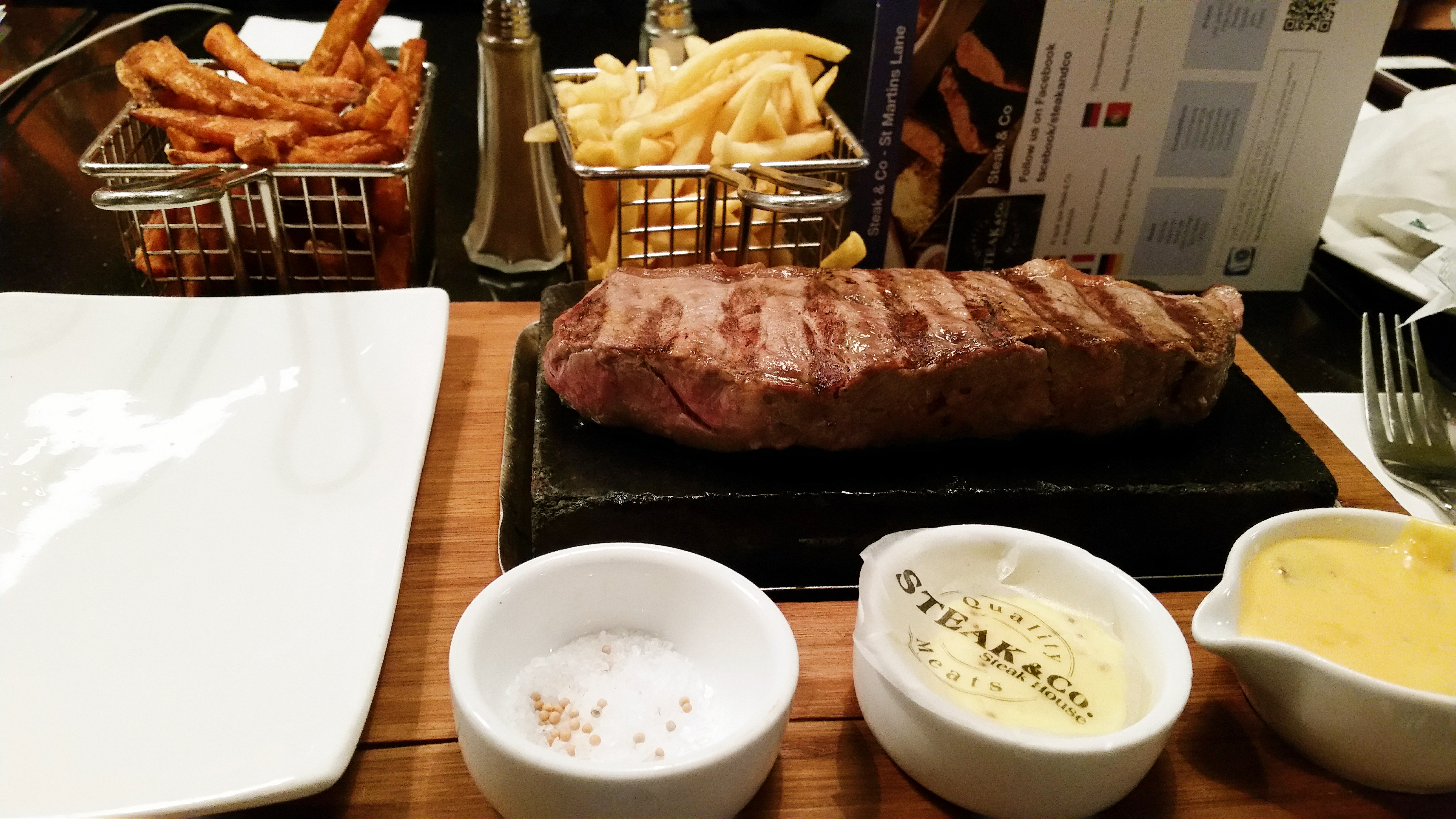 Steak and Co was the destination for Skater Boy’s 21st birthday, and our group was eager to feast on a cow each. Well maybe not the vegetarians who were with us. I highly commend their bravery for coming to sit inside a steakhouse. They’re as badass as the chicken who walked into Nando’s. My order included a medium-rare 10 oz halal sirloin steak with sweet potato fries, alongside mustard butter, mustard shake, and no sauce as none of them appealed to me, (and most of them weren’t halal). However, they gave me a non-alcohol containing sauce anyway, the flavour of which I cannot remember as it remained largely ignored. I generally tend to prefer the taste of a (seasoned) steak itself and that of it’s own juices, as opposed to the result obtained from drowning it in a bath of sauce.