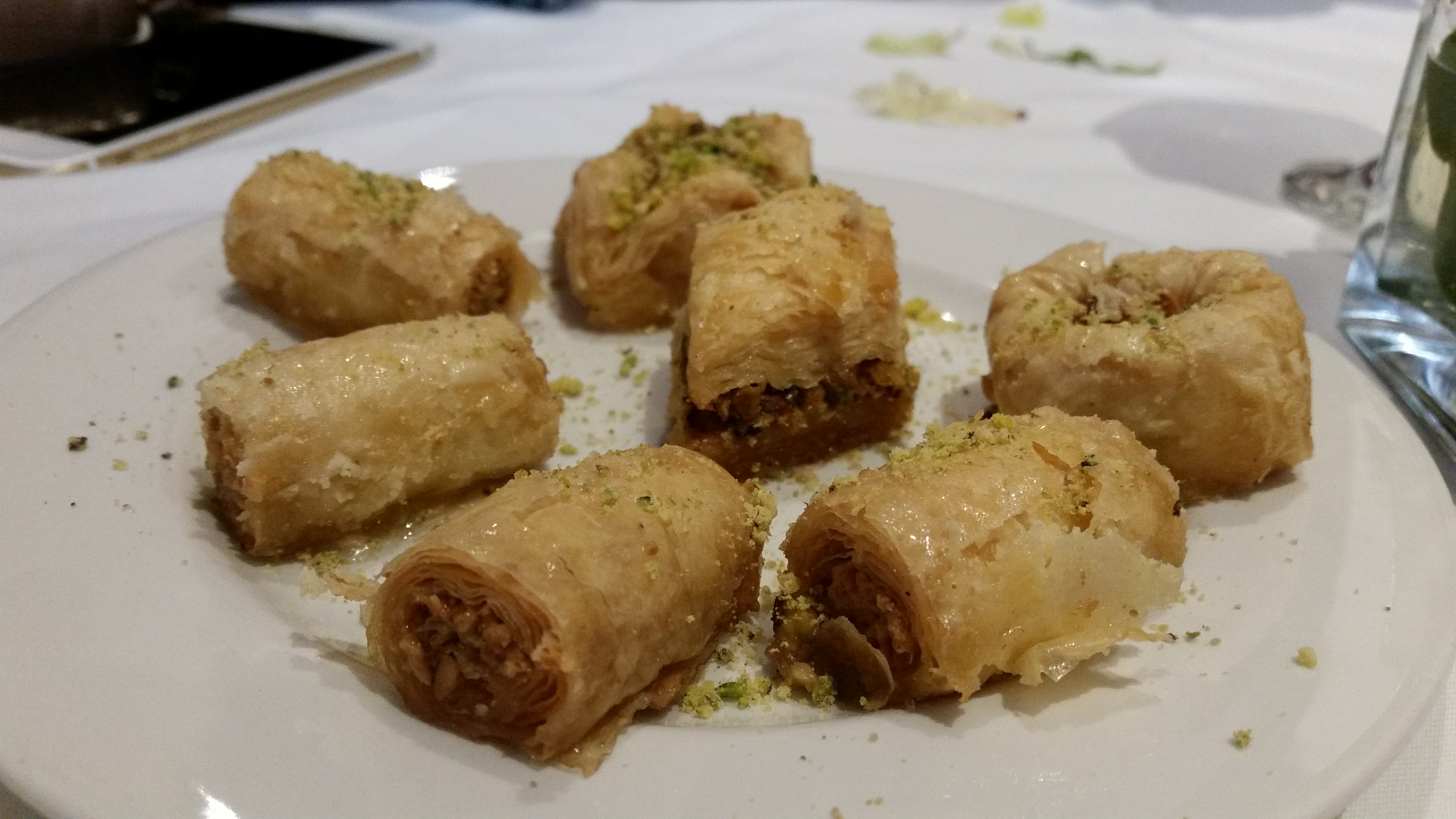 As the others mentally edged towards the door, eager to find a place for dessert – so they could spend every morning the next week crying whilst on their bathroom scales – my attention was drawn to the lebanese coffee. My eyes twitched and my addiction took hold and I just had to order one before we left. I asked for no sugar and challenged the waiter to brew it as strongly as he could, as the others looked away in horror and repulsion at the powerful concoction that arrived as a result. It was a refreshing change, considering people usually look away in repulsion when I arrive at a dining table. At the bottom of the cup, lay the thick and dense sediment I was expecting, covered by the dark nectar of goodness. The waiter had delivered well, as the brew was very strong indeed. The main body of the coffee was surprisingly very light in density, delivering a mild bitterness with each sip, alongside a strong aroma that was creamy and floral in nature. The kind waiter also treated us to a complementary plate of baklavas, which were fairly rich and sweet, and complemented my coffee well.