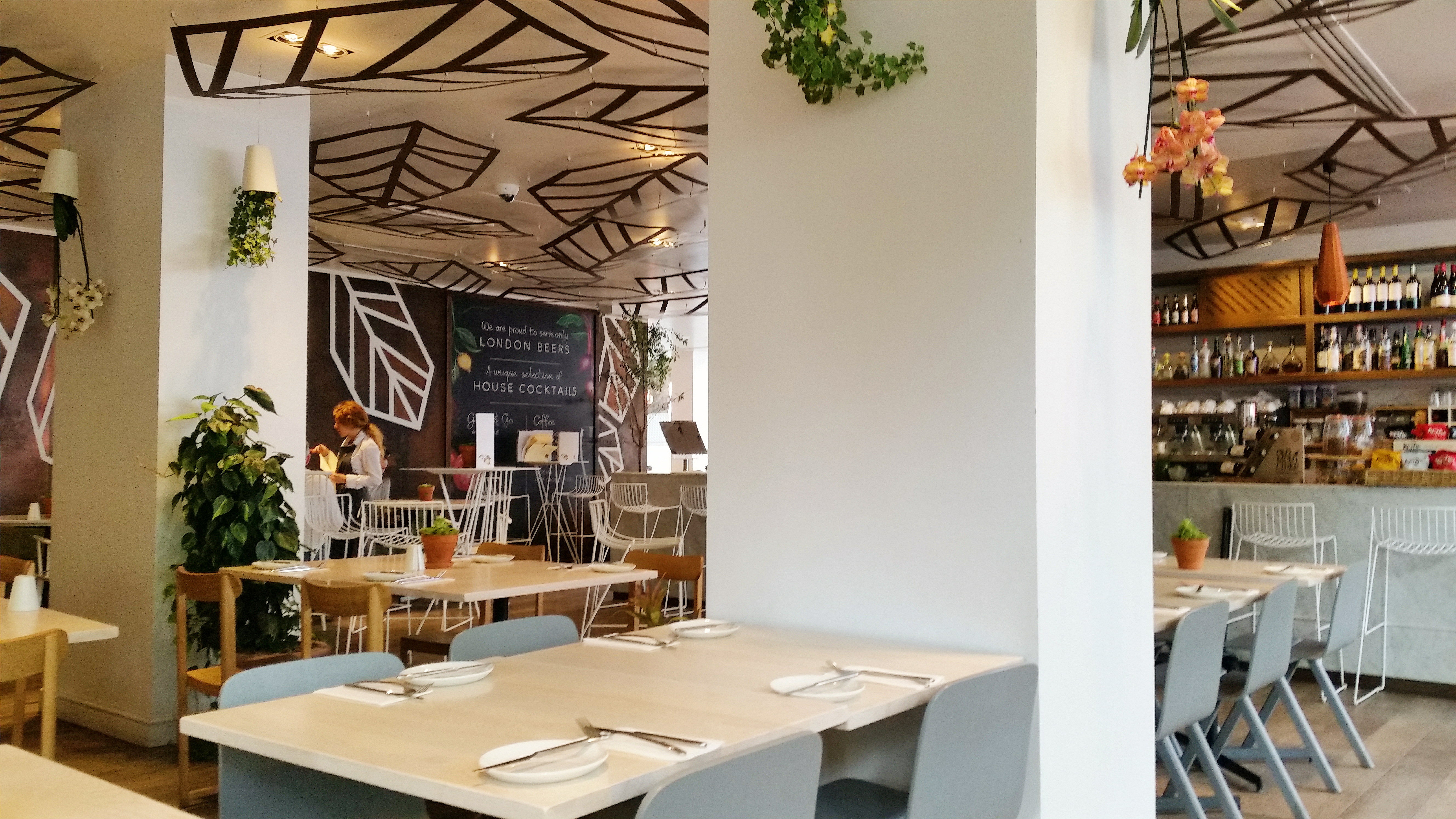 Urban Meadow Cafe is a fairly large cafe attached to the “Double Tree by Hilton” hotel, overlooking the relatively quiet, far northwestern corner of Hyde park. It boasts an attractive-looking outdoor seating area (or at least, potentially attractive when the sun comes out), with fabric sofa seats, wooden tables, and garden umbrellas – the pinnacle of British summer-optimism. The interior decor is simple and naturalistic, with plain white walls carrying the odd leaf-patterned mural, pillars adorning shrubbery, light wooden flooring and simple furniture, as well as leaf-shaped fixtures hanging from the ceiling. As a result, it has a very cosy, earthy feel to it. Though that can be a little concerning too, as you’re never really sure if there’s a vegan hiding nearby, waiting to attack you with a carton of soya milk.