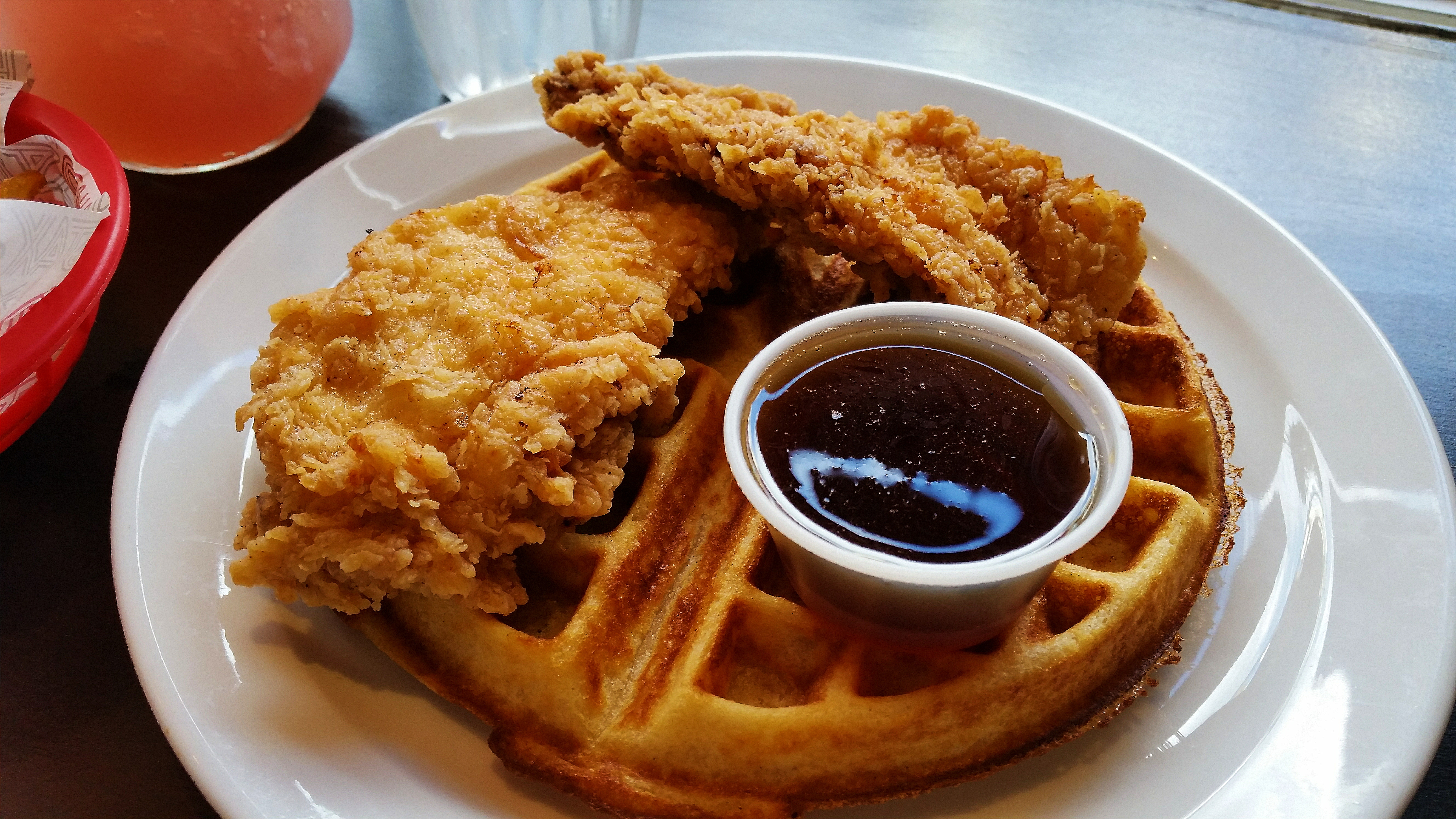 Buttermilk chicken breast with buttermilk waffle and maple syrup