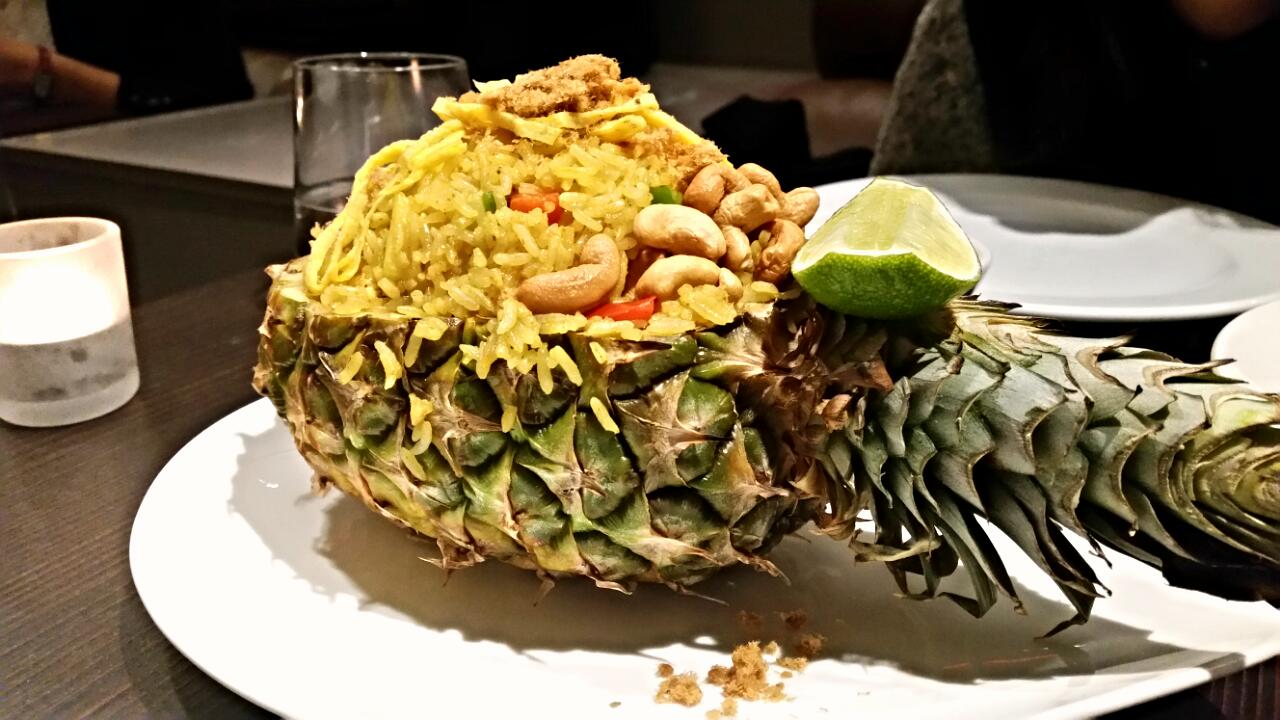 Steak and I ordered a mixed satay for starters, kow pad saparot, and chicken penang red curry with sticky rice for mains. The mixed satay comprised of two chicken satays, two beef satays, and one mixed seafood satay, served with peanut sauce and an assortment of salad. The chicken satay was well cooked, moist and though quite firm, remained tender. They were also very flavoursome, delivering a strong hint of lime leaves. The peanut sauce that accompanied the satays had a wonderfully strong, rich flavour, and a thick consistency which contrasted well with the crunchy texture of the peanut pieces within.