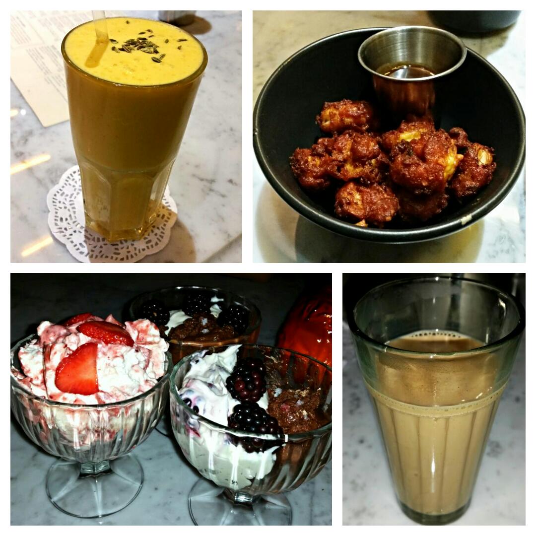 Mango and fennel lassi, prawn koliwada, guju chocolate mousse and house chai