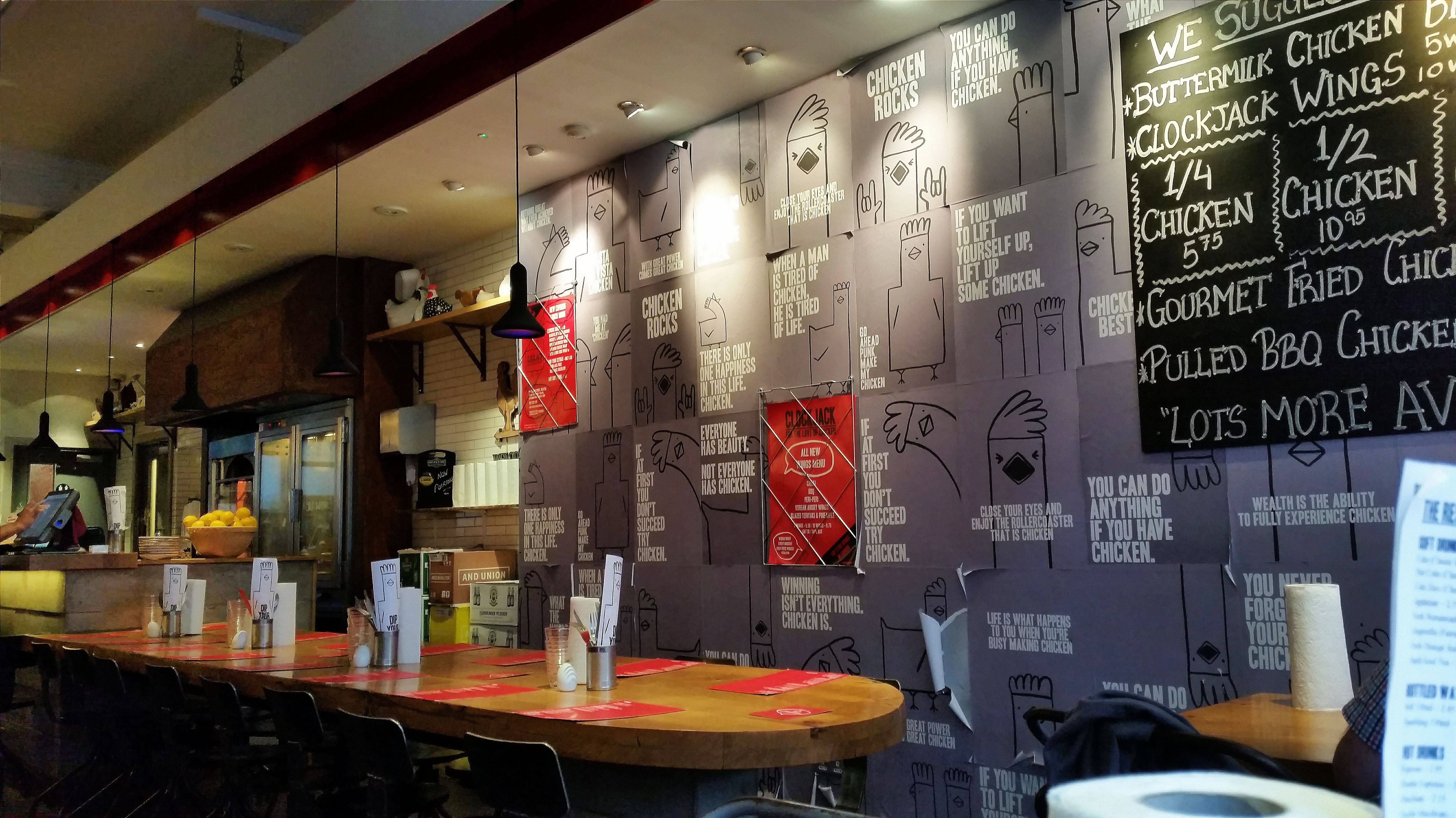 As I have already mentioned, Clockjack is a fairly simple restaurant, and as such, has a fairly simple but attractive diner-style decor, with simple wooden tables, chairs and booths. My favourite feature is probably their rather simple-looking mascot who occupies some of the walls. Whilst his thin, boxy shape may not be as attractive or as flamboyant as the more bulked out mascot of Nando’s, his boisterous personality and clucks of wisdom more than compensates. The restaurant is a quick five minute walk from Piccadilly Circus station.
