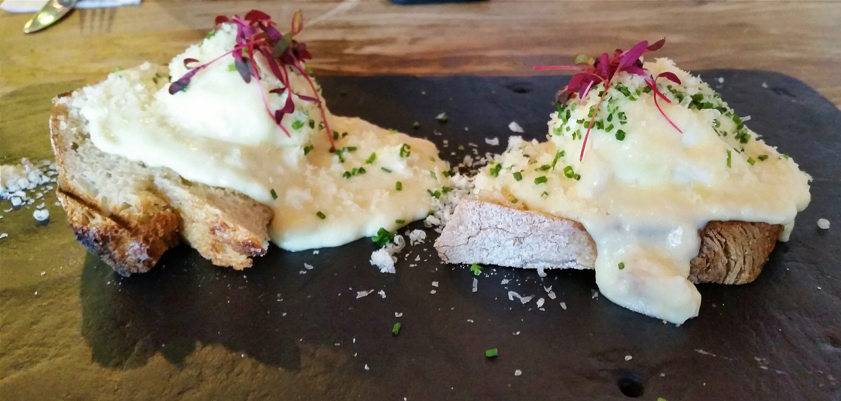 Poached eggs with smoked haddock, caremlised cheese sauce, parmesan, and sourdough toast