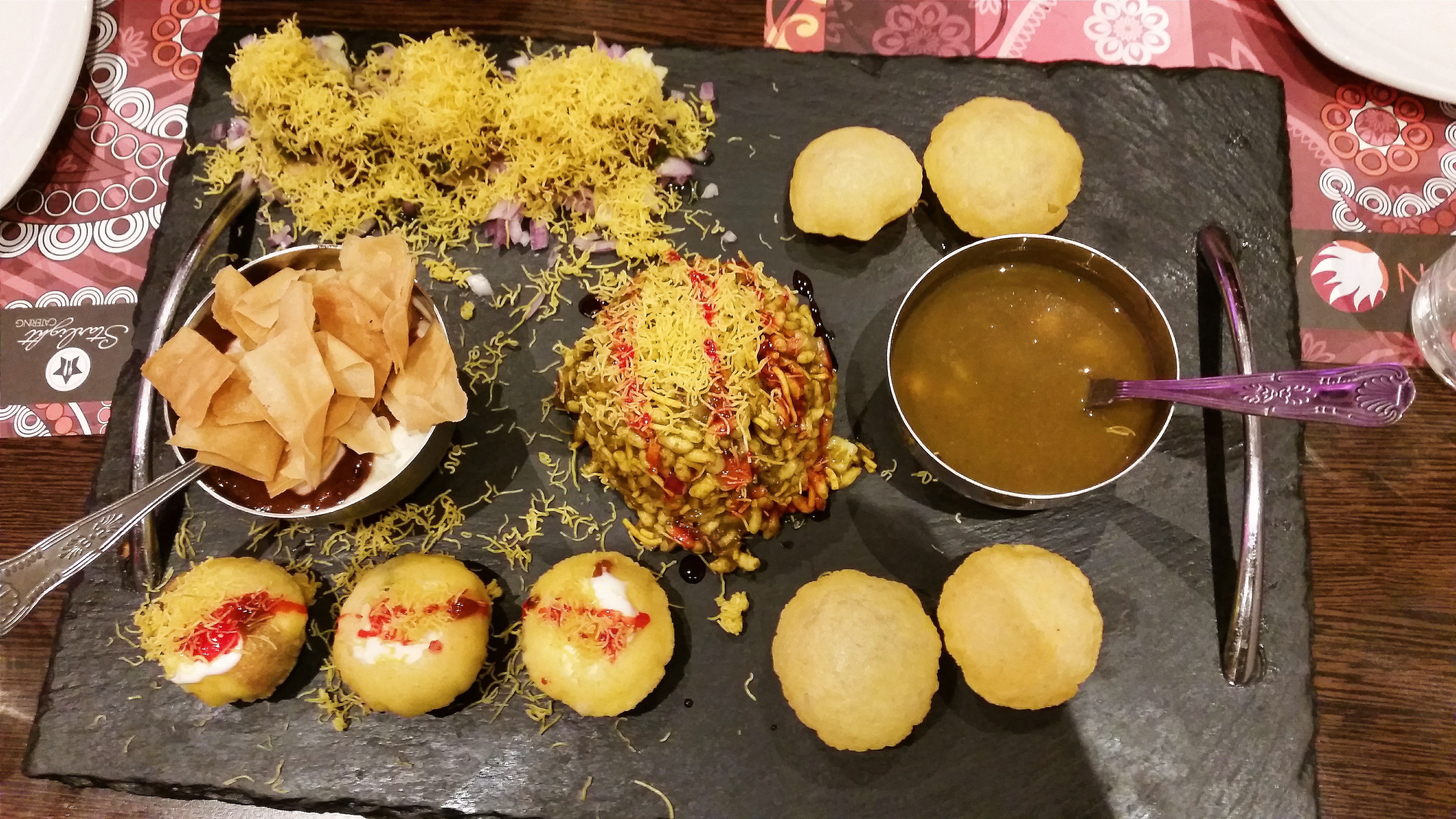 To begin our feast, we ordered a “mixed chaat platter” to share, which consisted of a selection of dahi puri, paani puri, bhel puri, sav puri, and chaana papdi chaat. If you are not South-Asian, do not worry – I have no idea what half of those words mean either. This platter is suitable for around two to four people. Each chaat item delivered a fantastic set of crispy, crunchy textures and mild, savoury flavours, but the bhel puri was the real highlight. With a sticky, glazed texture that contrasted well with the inherent crispness of its constituents, it was both addictive and delectable.