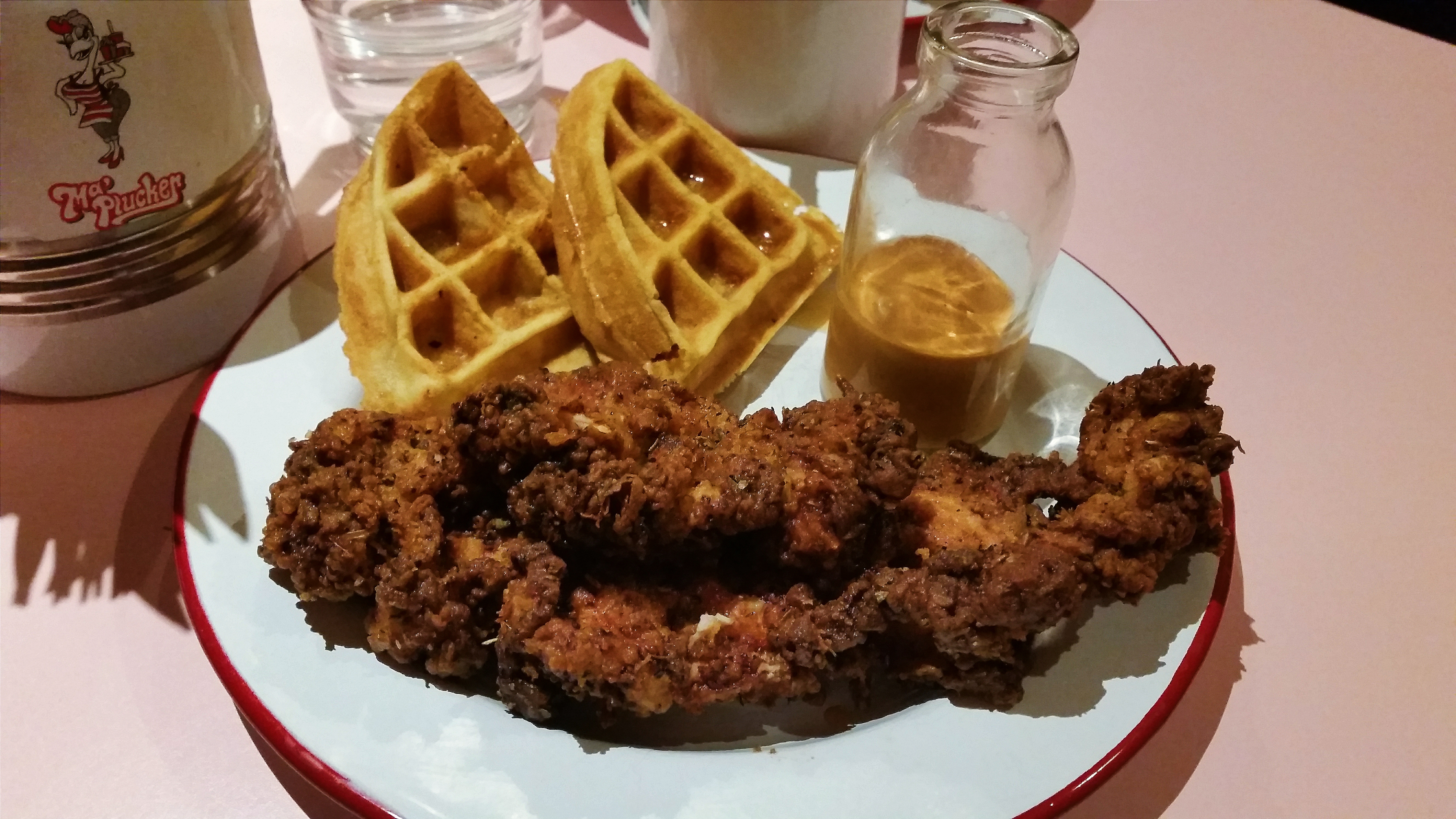 As I’ve already mentioned, Ma Plucker offers three choices of chicken – fried, rotisserie, and pulled – and on this occasion, I decided upon a combination of “maple waffle” and “buttermilk-coated fried chicken-thigh”. Given that I had already experienced the culinary epiphany associated with this seemingly-unholy, (but ultimately divine), combination at Stax Diner, I was eager to see how Ma Plucker’s incarnation would compare.