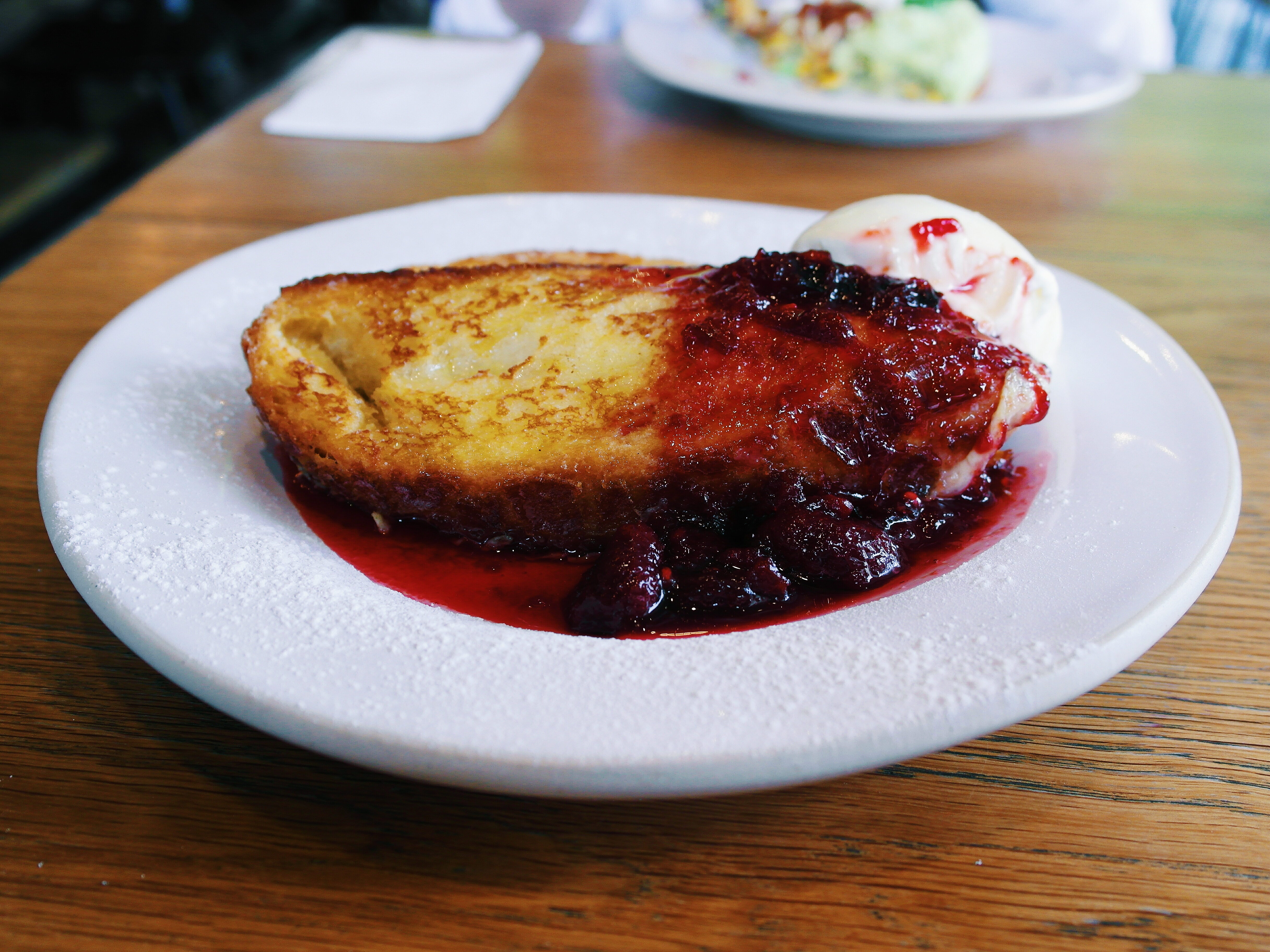 Whilst I eagerly waited for Steak to feel full and hand over the remainder of her pancakes, I dug in to my helping of brioche french toast – made with Gail’s signature dark french sourdough by default, and served with raspberry compote and crème fraiche. Personally, I adore a good piece of fresh bread, and the high quality of the dark french sourdough was instantly evident in its soft but firm core, and its beautifully chewy crust. Each piece possessed a sticky, glazed surface, which added a subtle sweetness to the bread, and contrasted well with the tartness of the raspberry compote. The crème fraiche, by contrast, was fairly neutral in flavour, and together with its smooth and light consistency, it added a cleansing dairy freshness to the palate. (Though, in reality, its high fat content was probably about as “cleansing” as an intravenous injection of butter).