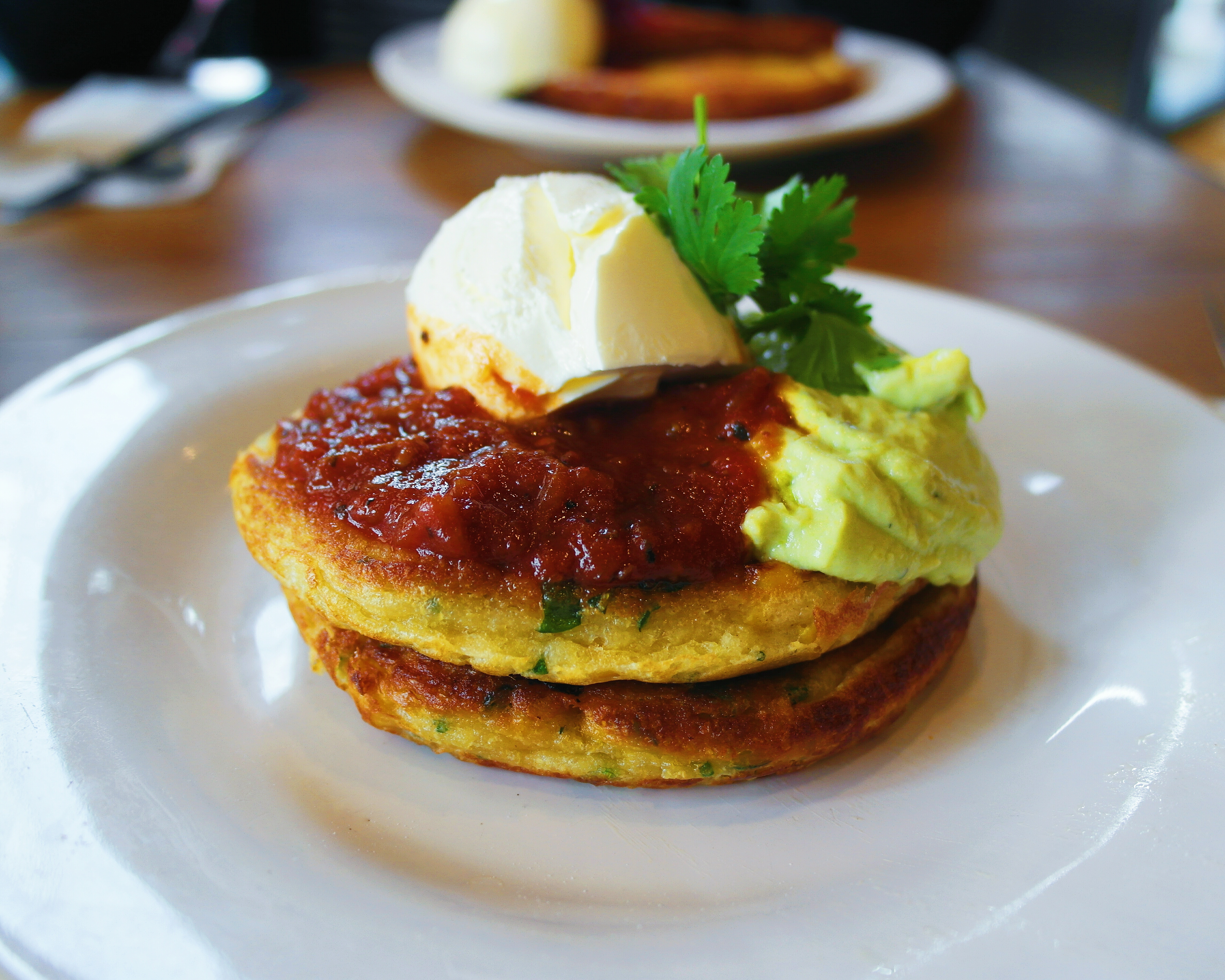 Sweetcorn pancakes with salsa, avocado and sour cream