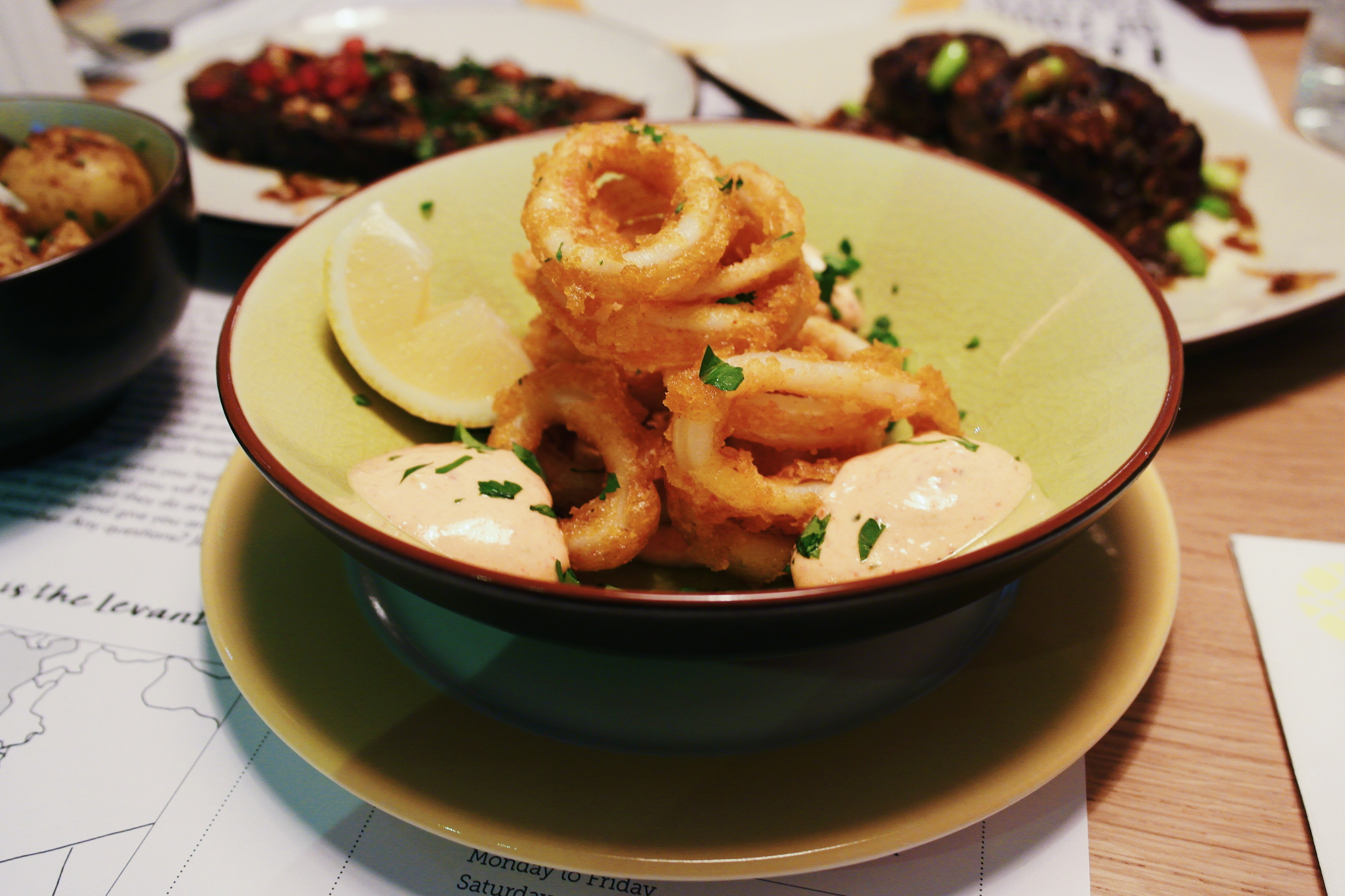 For us, the first item to be devoured was a bowl of battered squid, served alongside a mild harissa yoghurt. The soft rings of squid were covered in a thin, crispy coat of batter, and its subtle, spiced flavour was complemented well by the smooth and creamy yoghurt. Our side order of roast potatoes also got on well with the harissa yoghurt, and if you do order them both, be sure to dunk away.