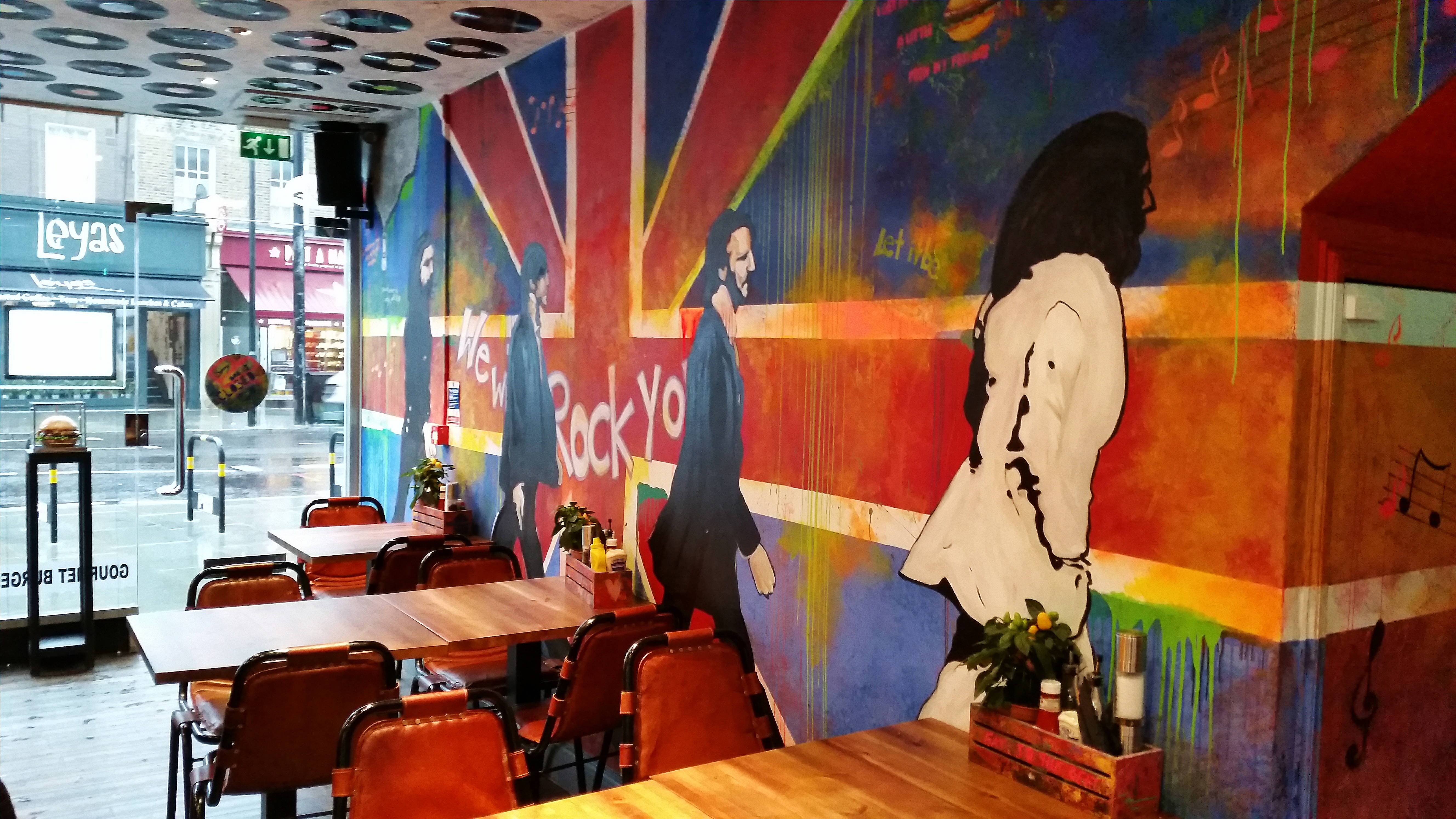 If you choose to visit the Camden branch, you will quickly find that Britain’s rock culture is heavily emphasised in the decor, which sports a number of musical murals and furnishings. Cheap and cheerful guitars are mounted on the walls, vinyl records are stuck to the ceiling, and a significant amount of effort has been spent on fine details. Chilli plants also sit at each table, with whole chillis free for you to pick and eat alongside your burger, or spitefully stuff up the nose of your dining companion – should they begin to irritate you. Every inch of the restaurant is bright and colourful, and the trippy styling seems to have been achieved by combining a paint set, a bag of sugar, and an eight-year-old-child.