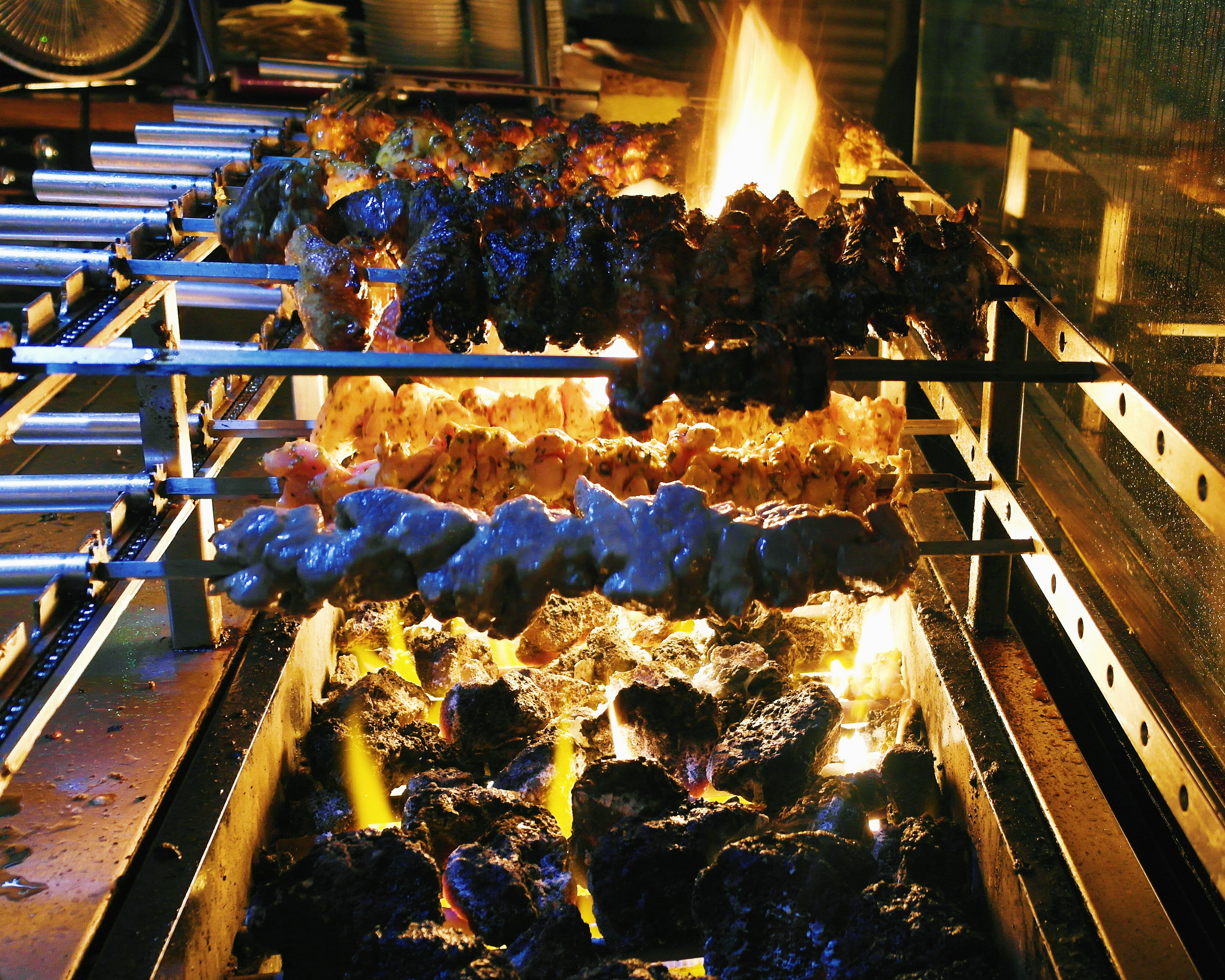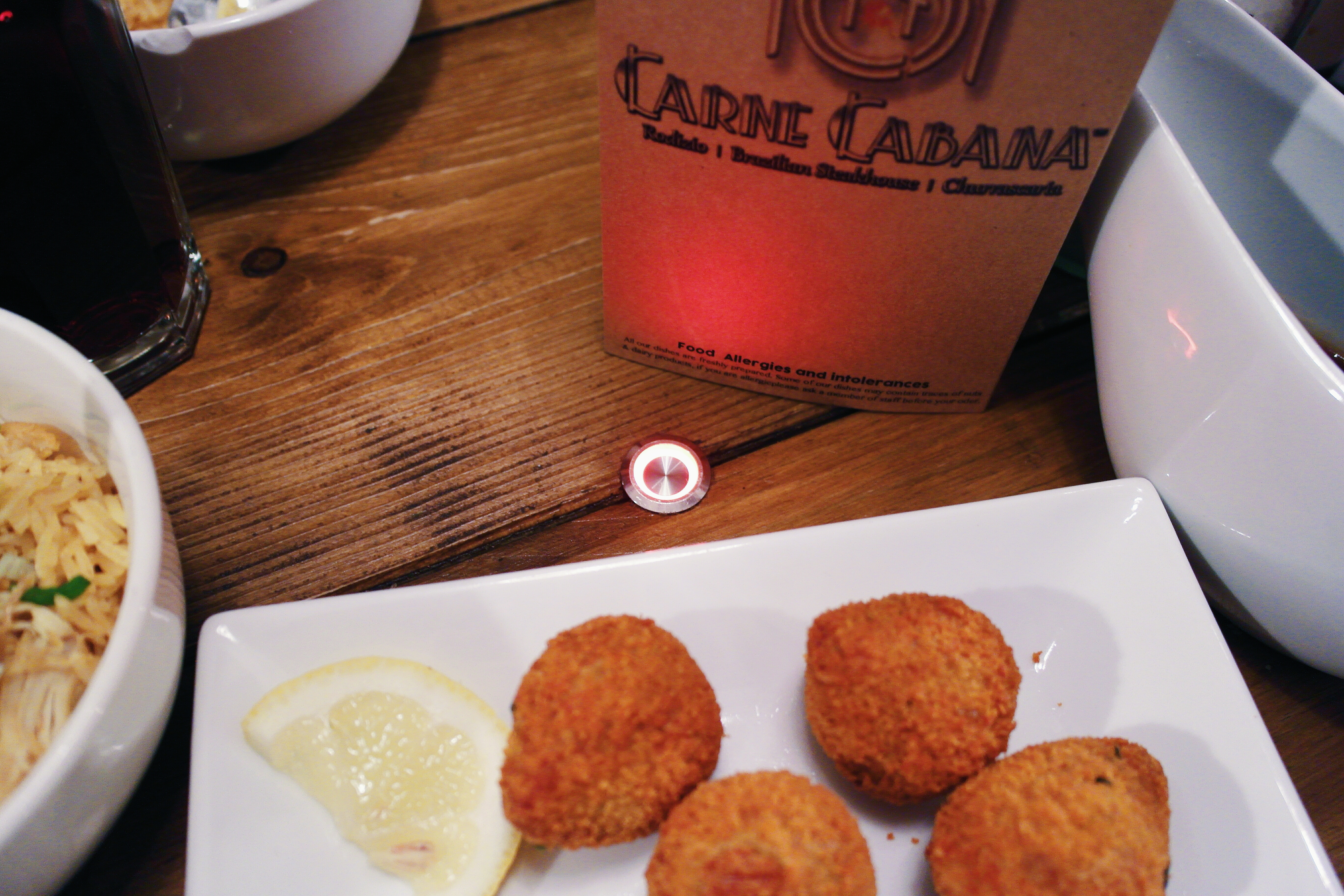 As we settled into our seats, our friendly waitress proceeded to explain the mechanics of the restaurant. We would each get a choice of three sides and a soft drink, and thereafter, be welcome to press the shiny “meat” button in the middle of the table. At first glance, the whole thing seemed like an MI5 sting operation to incriminate “trigger-happy Muslims”, but our waitress assured us that it was simply a “go” signal to summon as much meat as we could handle.