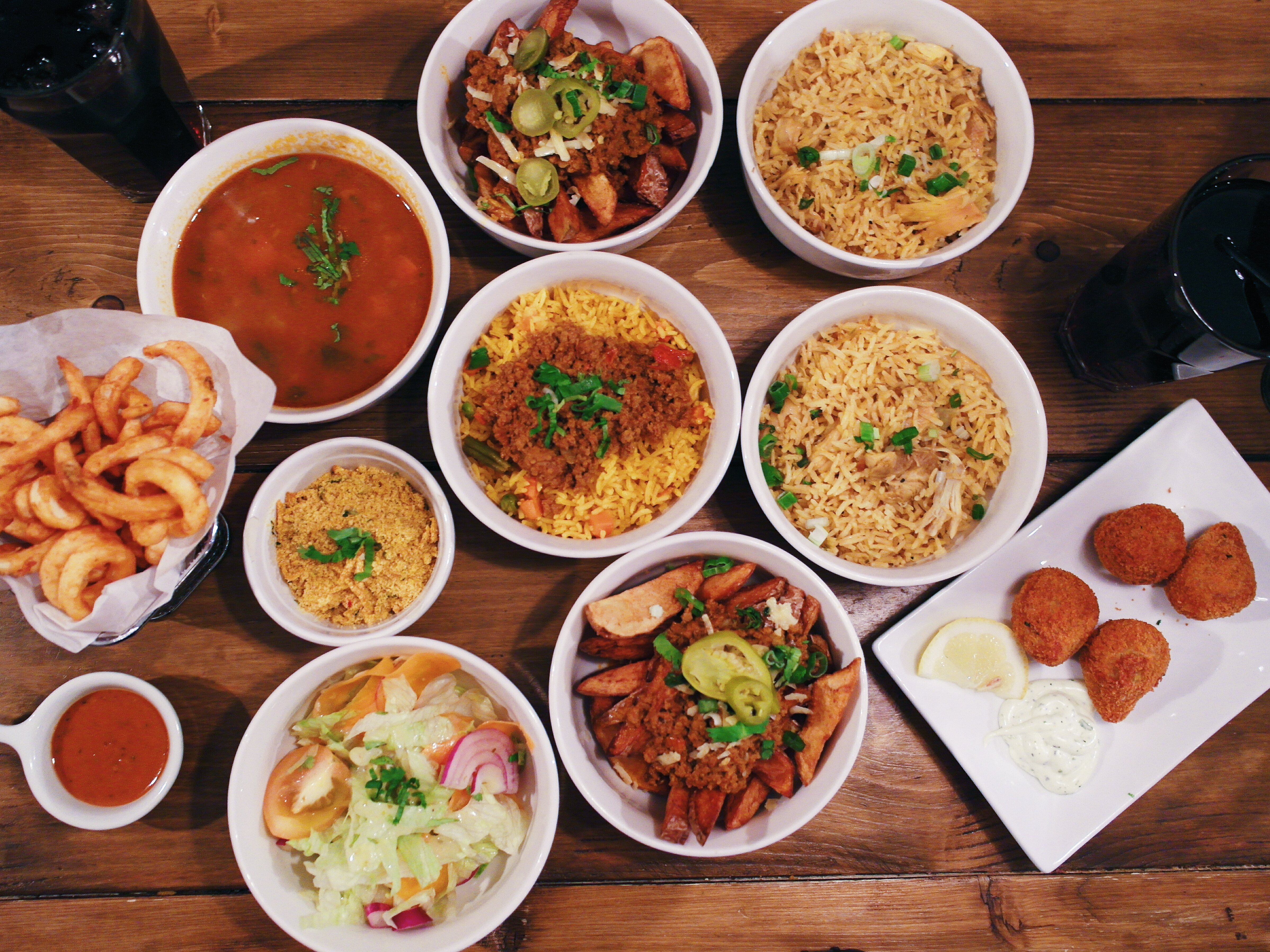 Beef stew (top left corner), carne chips (top and bottom centre), beef rice (centre), and chicken balls (bottom right corner)