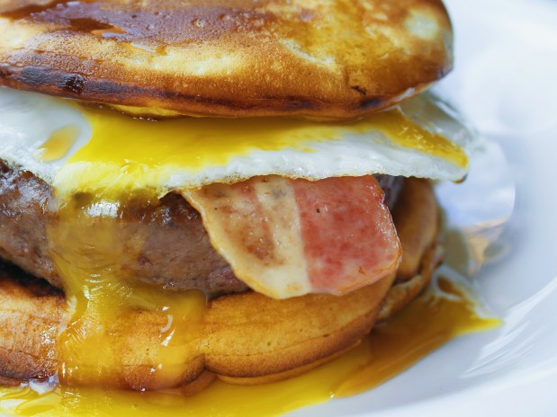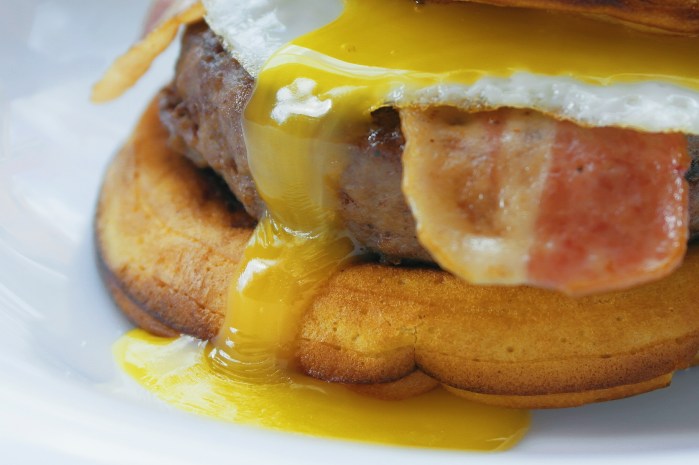 Many of you will know that I’m a big (-bellied) advocate for combining sweet and savoury, so a pancake burger seemed like a natural choice. Sweet, fluffy pancakes, succulent Angus beef, and smokey turkey bacon. Delicious, diabolical, and absolutely deadly.