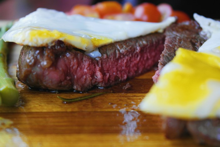- In a separate pan or pot, fry or poach your eggs. Finally, put everything together, and once your steak has been rested, cut in and feast like Arnie himself.