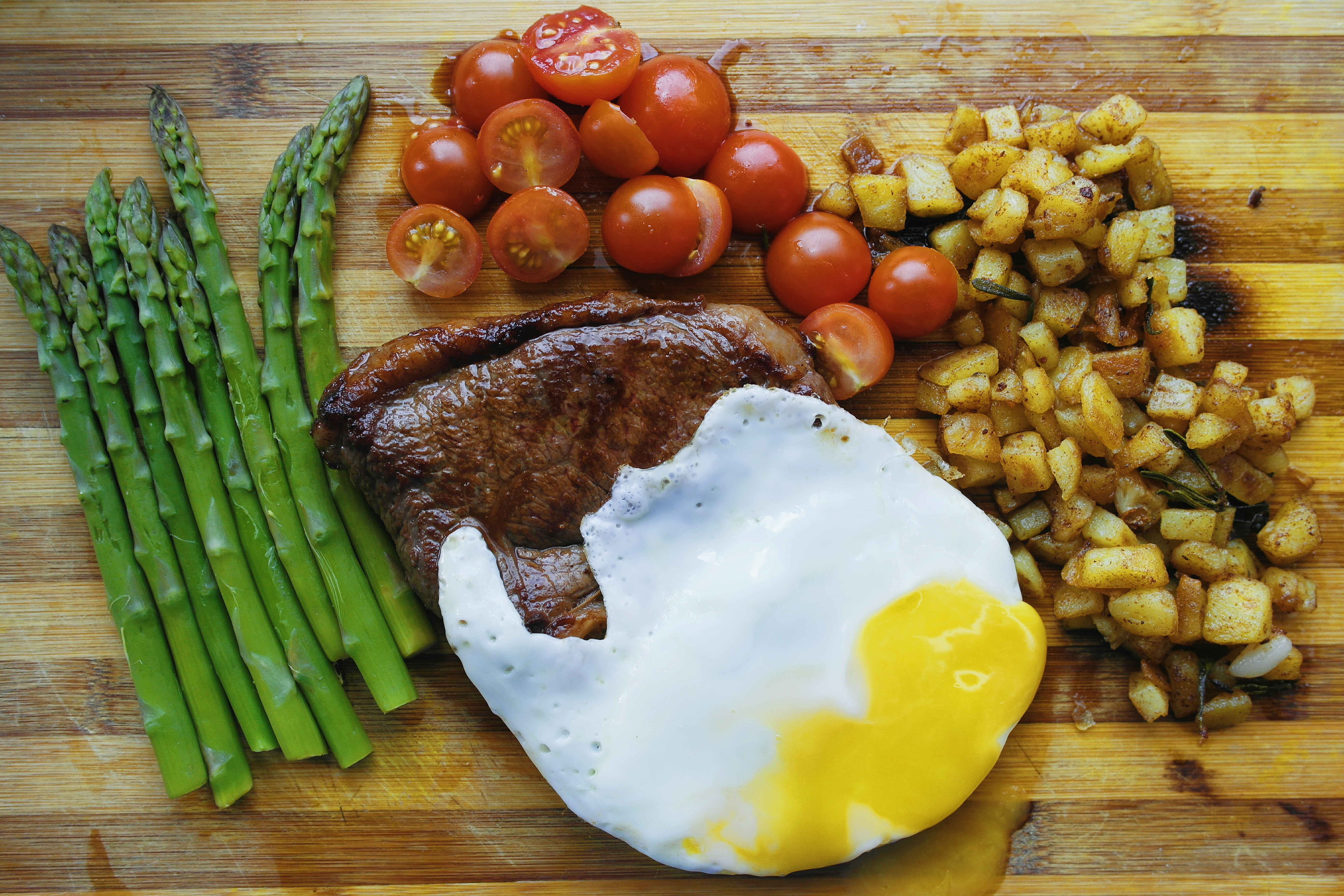 Amongst the bodybuilding world, a hearty plate of steak & eggs is the king of all breakfasts. Here, we’ve cooked it up with a side of sautéed potatoes, steamed asparagus, and cherry tomatoes.