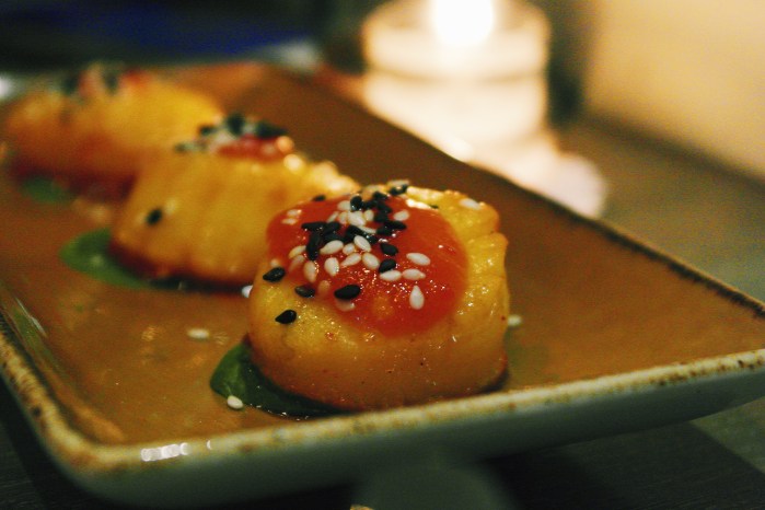 Pan-seared scallops (Or perhaps “Paan-seared scallops?) (£9) *Recommended*