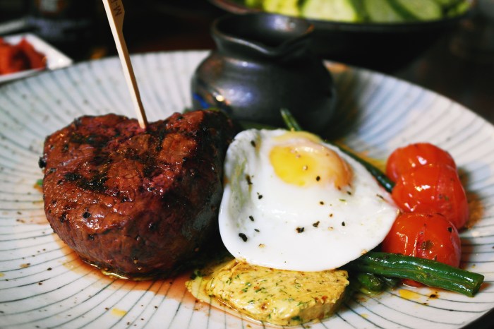 For mains, I opted for a 250 gram dose of fillet steak, served with a fried egg, herbed butter, french beans and cherry tomatoes. Cooked to a near perfect medium-rare, this succulent fillet oozed with inherent juices, and retained, for the most part, a reasonable depth of flavour. Texturally however, the fillet could have done with a broad, firm crust, which was sadly overlooked for a neat set of grill marks – (which does well to make a steak look pretty, but does little else to enhance the flavour or texture).
