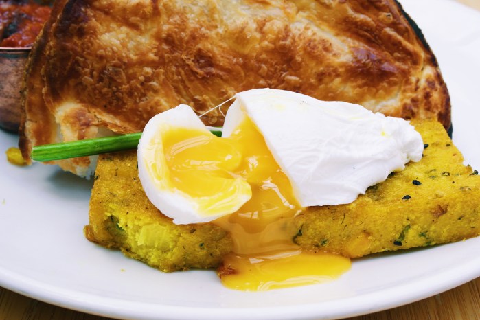 Steak meanwhile, had opted for the “Vege fry up”, which consists of a fried or poached egg on request, a fried corn and polenta cake, paratha, grilled halloumi, garlic butter, seasonal greens, smashed avocado, a portobello mushroom and a house-made BBQ and black bean sauce.